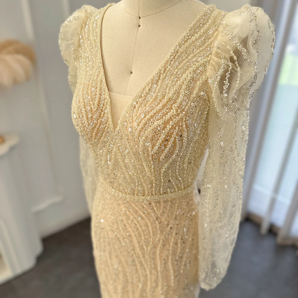 Turn Heads in This Champagne Beaded Evening Gown with a Deep V-Neck, Sheer Sleeves and Mermaid Fit – Perfect for Weddings and Formal Occasions.