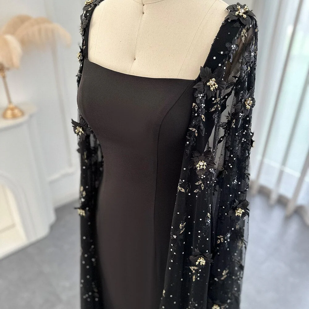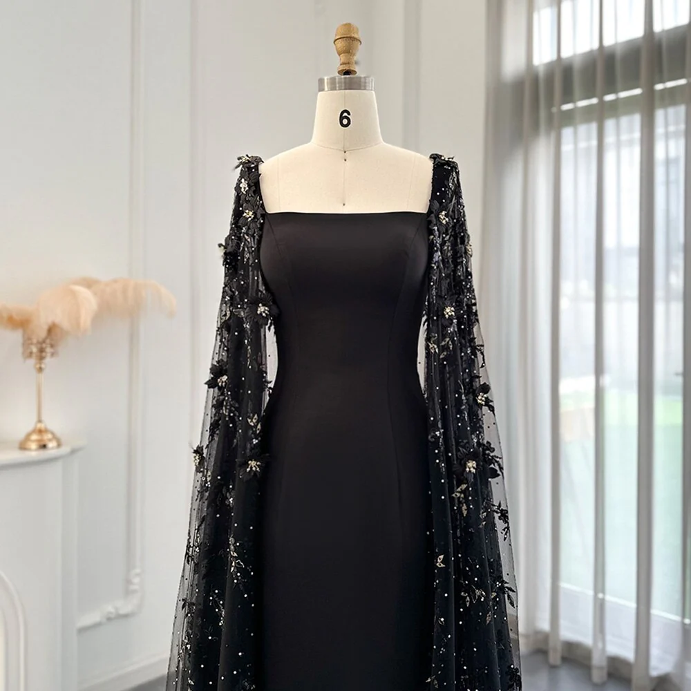 Stunning black evening gown with sleek silhouette and sequin-embellished sheer cape, perfect for receptions, galasand luxury evening occasions.