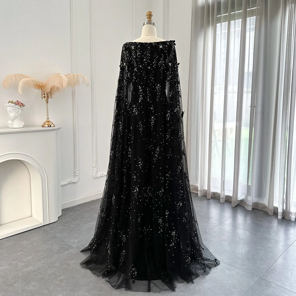 Black Evening Gown with Sequin Embellished Sheer Cape