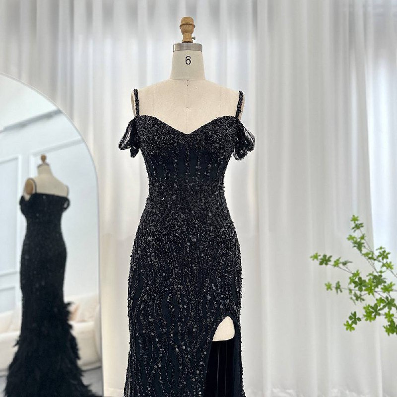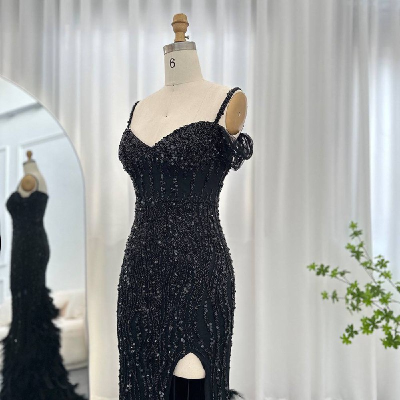 This stunning black mermaid evening gown is designed to make a bold and elegant statement. Crafted with shimmering sequins throughout the body, it beautifully contours the silhouette while adding a luxurious sparkle. The gown features delicate off-shoulder straps, a flattering sweetheart neckline and a dramatic thigh-high side slit. The bottom is adorned with voluminous black feather detailing, delivering a glamorous, red-carpet-ready finish. Perfect for prom, galas, formal nights and special occasions where sophistication is key.