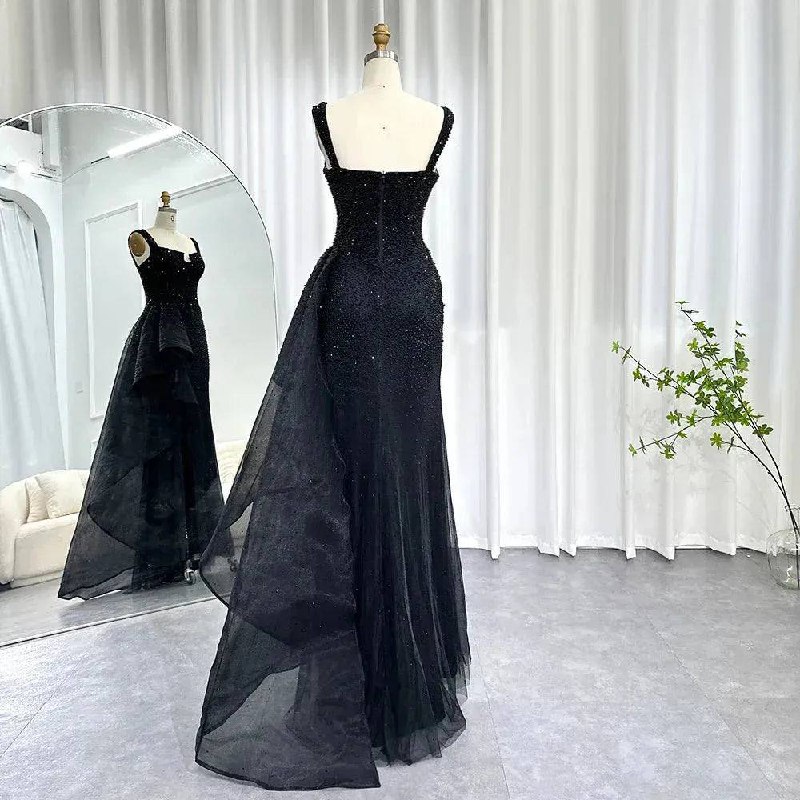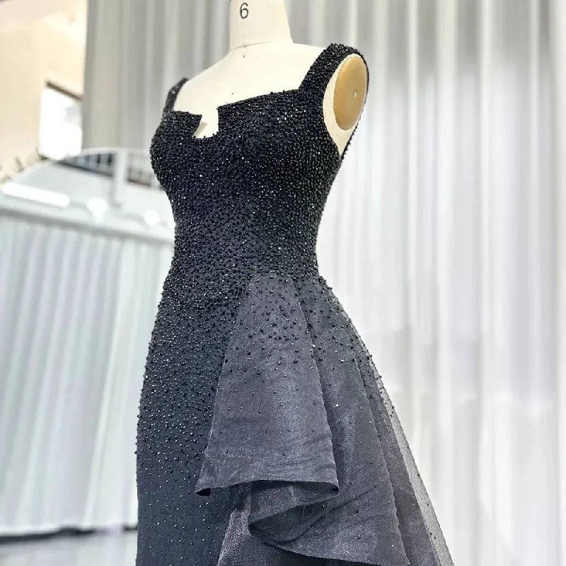Turn heads with this captivating black evening gown crafted for women who love elegance with a dramatic edge. The fitted bodice features intricate hand-beaded embellishments that add a refined shimmer. Its unique asymmetric layered drape on one side creates a luxurious, sculptural effect, flowing into a sheer overlay skirt for added sophistication. Perfect for receptions, red-carpet events, formal nights and special celebrations, this gown delivers both glamour and grace in every step.