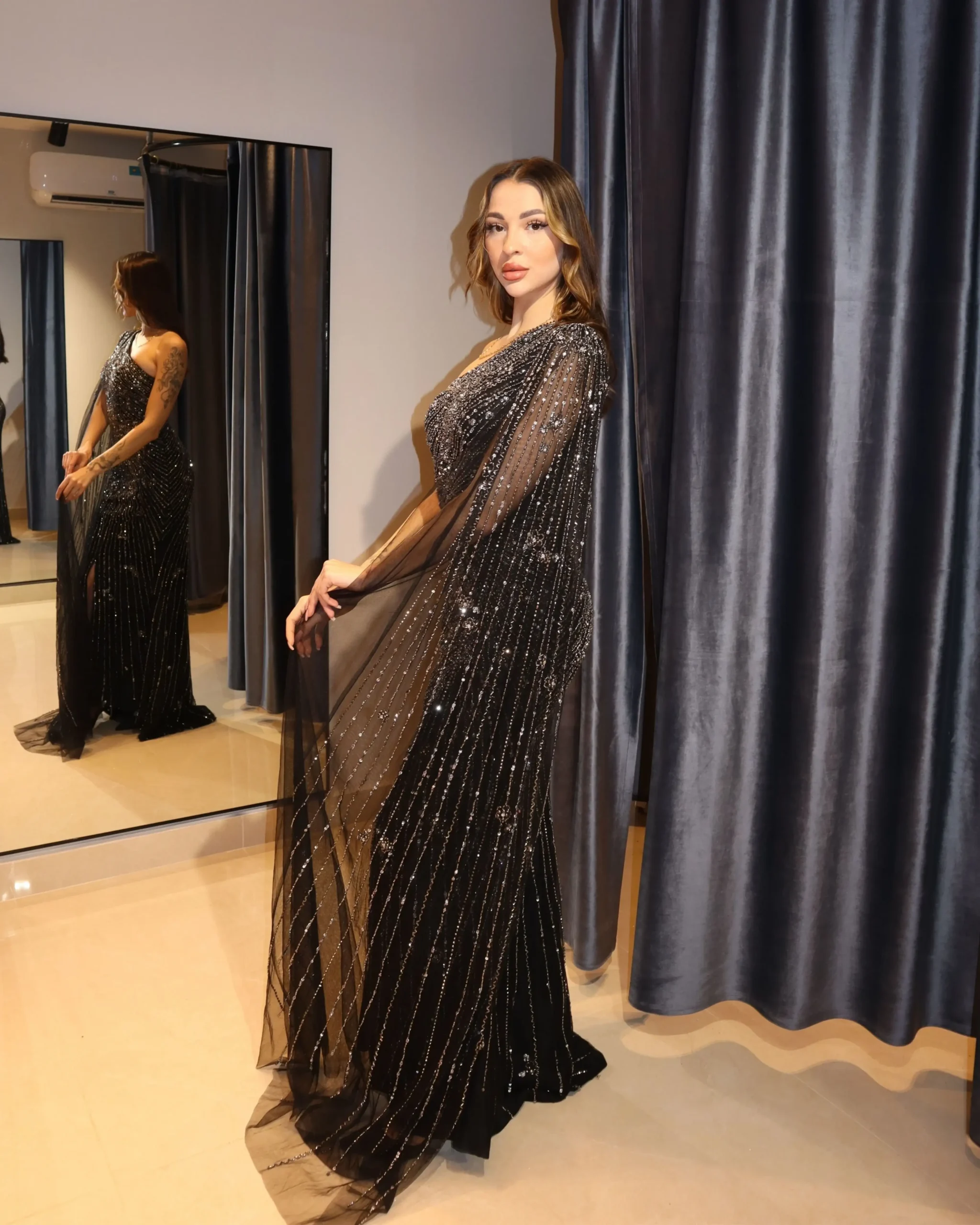 Step into effortless glamour with this breathtaking black evening gown designed to make a lasting impression. Featuring a one-shoulder silhouette adorned with intricate sequin detailing, this dress beautifully contours the body while adding a radiant sparkle. The highlight is its sheer draped cape sleeve, flowing elegantly to create a dramatic and sophisticated look. Perfect for red carpet events, formal evenings, receptions, and luxury occasions, this gown blends modern elegance with timeless allure.