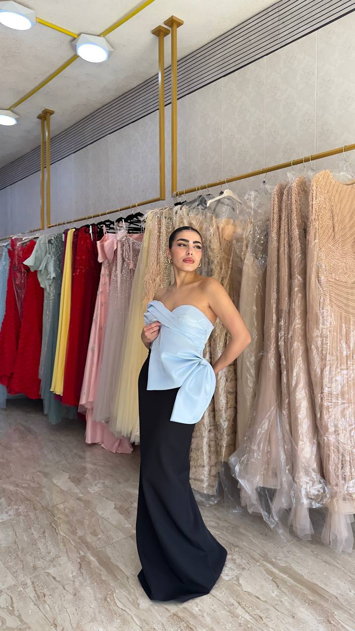 Black Strapless Gown with Blue Draped Bow Detail