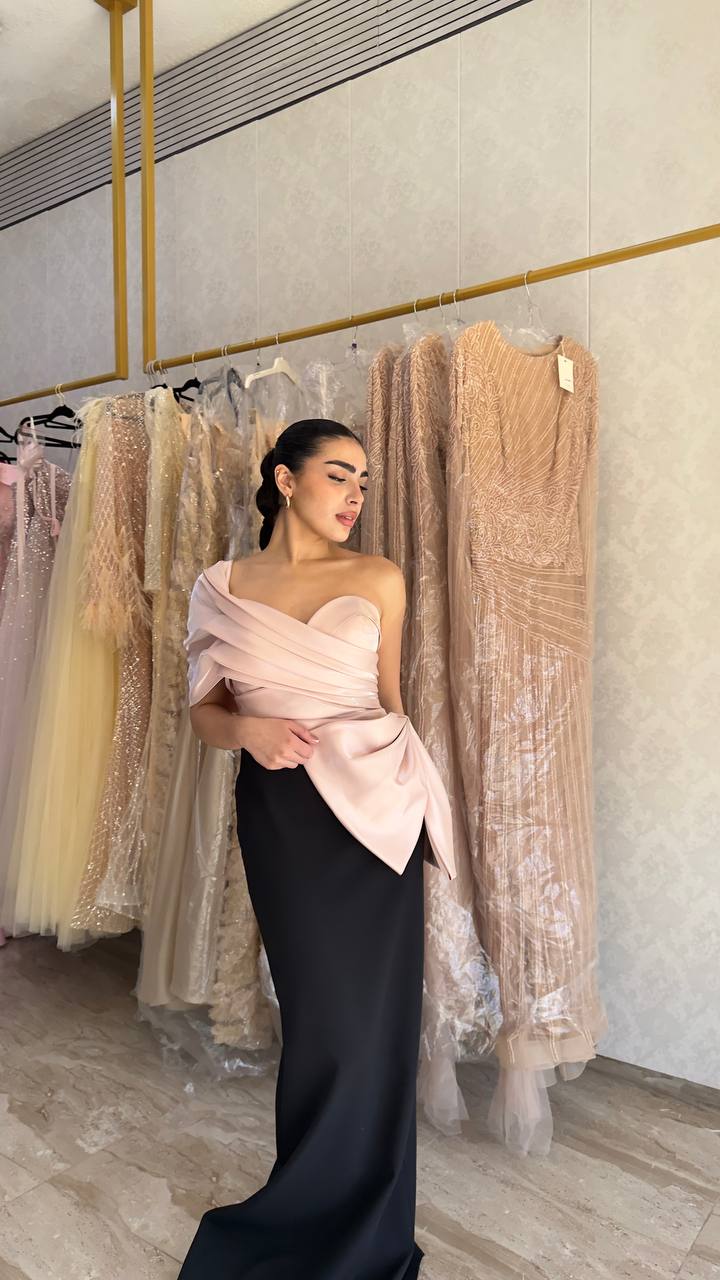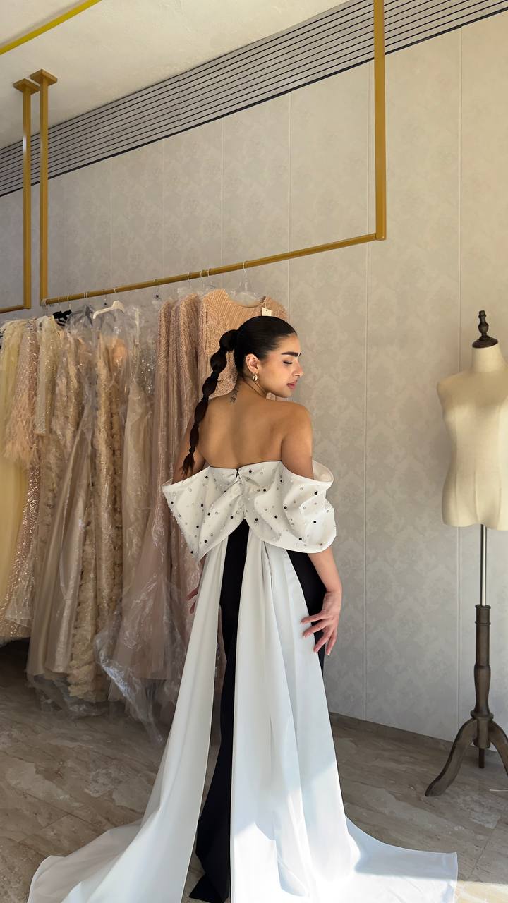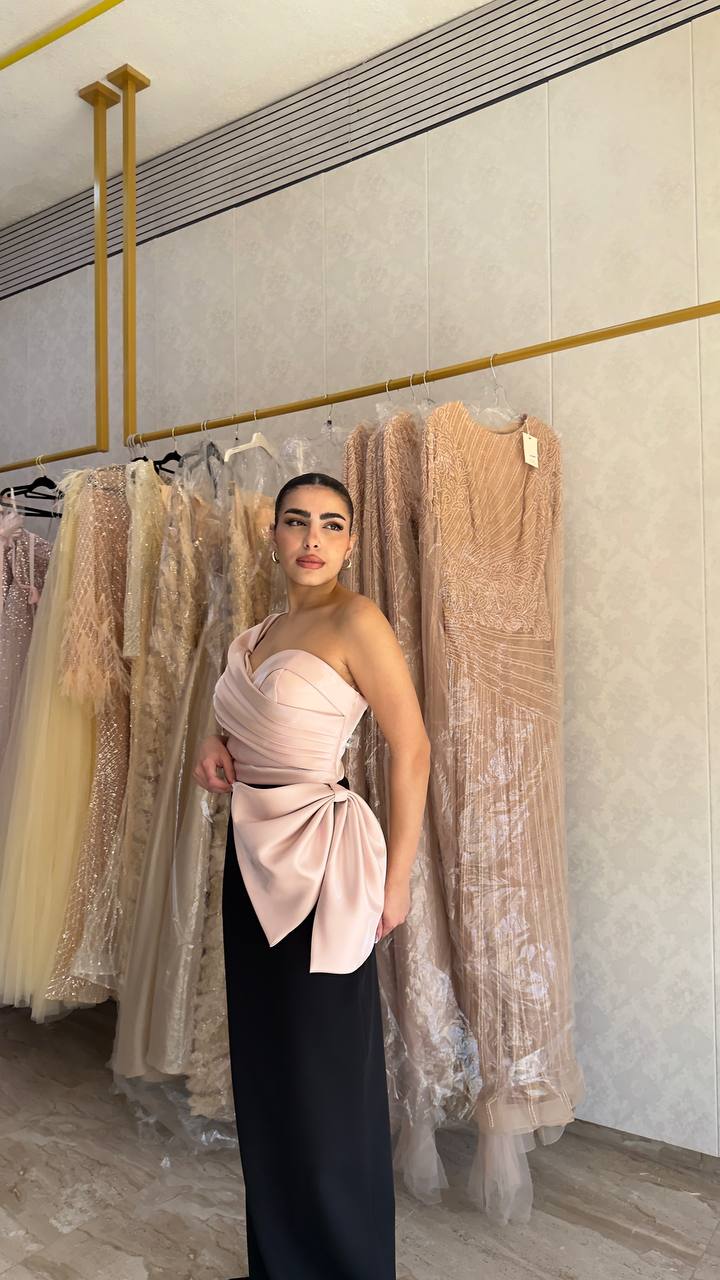 The standout element is the structured blue draped bow detail at the bodice, adding a bold yet artistic contrast to the minimal silhouette. The straight-fit design enhances the body’s natural shape, creating a clean and polished finish.