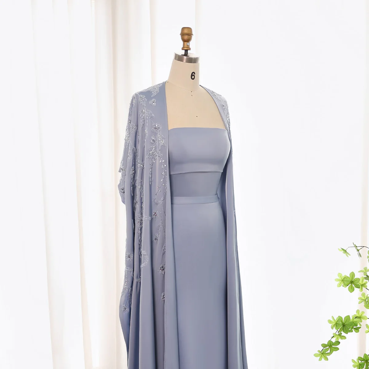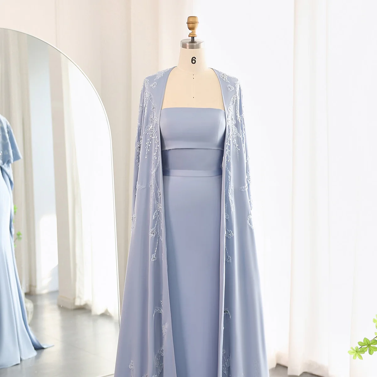 Graceful light blue strapless gown with sleek silhouette and embroidered cape overlay-perfect for weddings, receptionsand elegant evening events.
