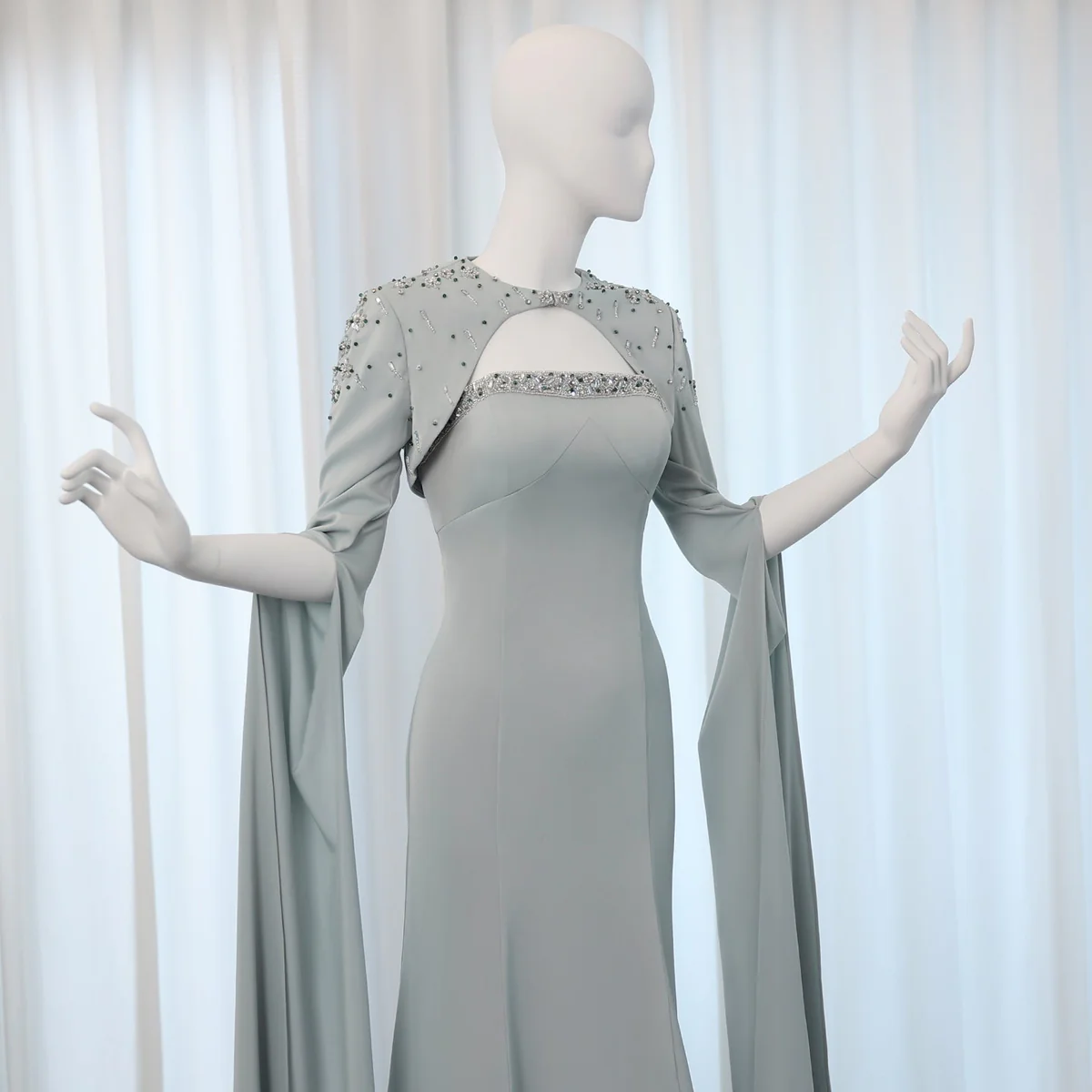 Elegant sage green evening gown with beaded cape sleeves, sleek fitted silhouetteand flowing hemline-perfect for weddings, receptionsand gala nights.