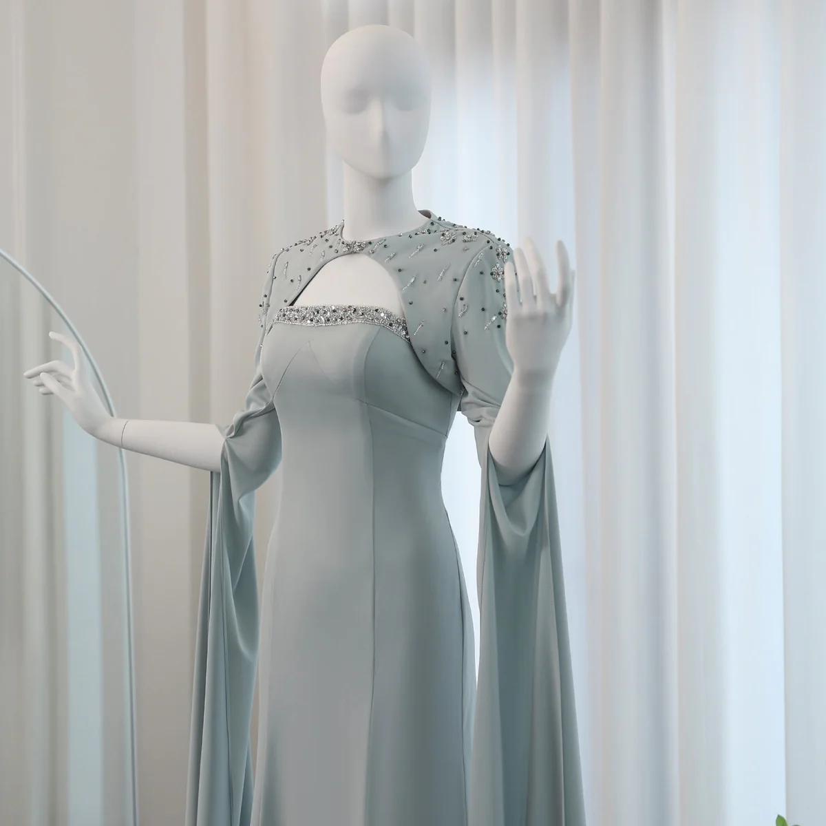 Step into Elegance with This Sage Green Evening Gown Featuring Beaded Cape Sleeves and a Sleek Silhouette-ideal for Weddings, Receptionsand Gala Events.
