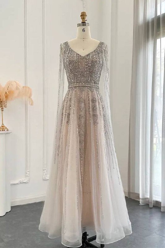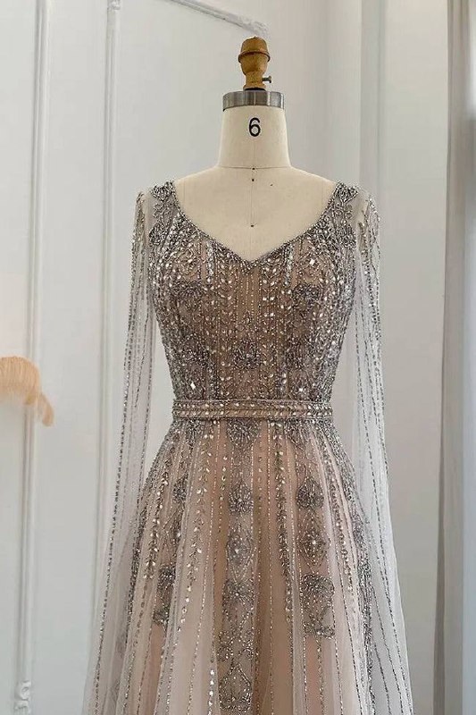 Step into timeless elegance with this stunning silver embellished evening gown, designed to make every moment unforgettable. The fitted bodice features intricate beadwork and shimmering sequins that beautifully catch the light, while the long sheer sleeves add a touch of sophistication. The soft layered skirt flows gracefully, creating a dreamy and ethereal silhouette perfect for formal events, receptions and special occasions. This gown blends glamour, comfort and craftsmanship for a truly captivating look.