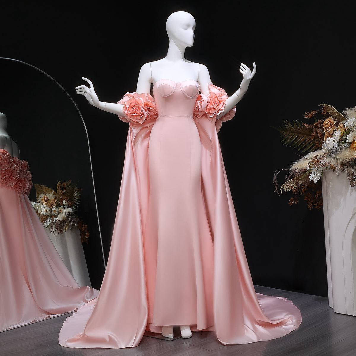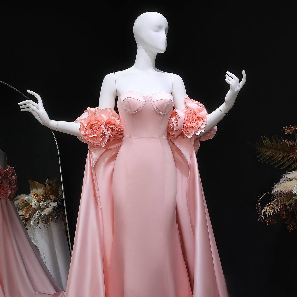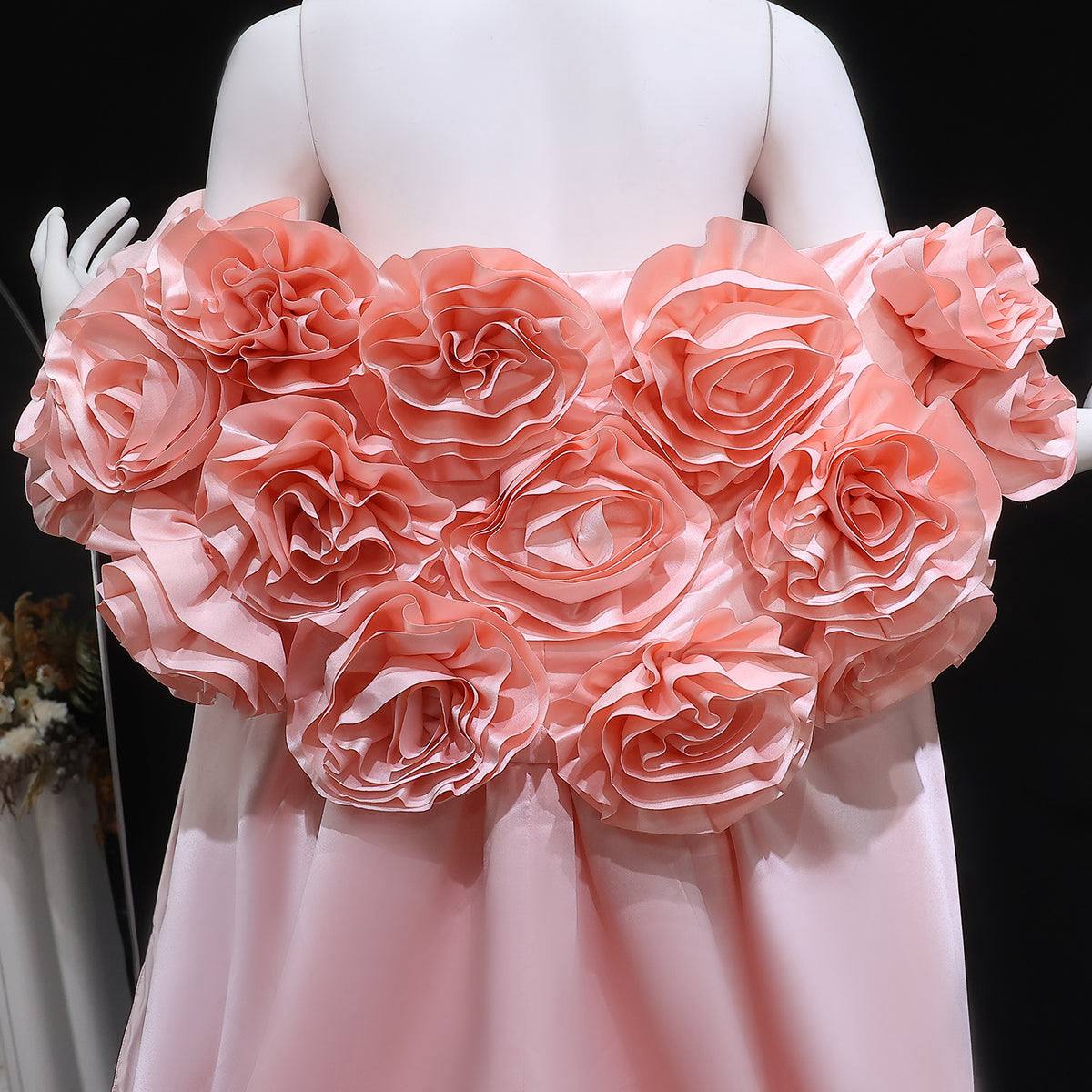 Make a soft yet striking statement with this blush pink evening gown, designed to embody elegance and artistic craftsmanship. The off-shoulder neckline is adorned with bold 3D floral appliqués, creating a couture-inspired look that adds volume and texture to the bodice.