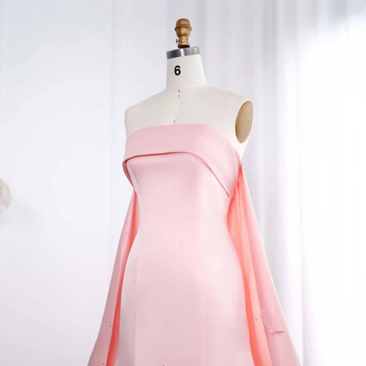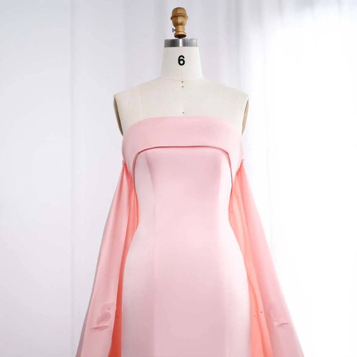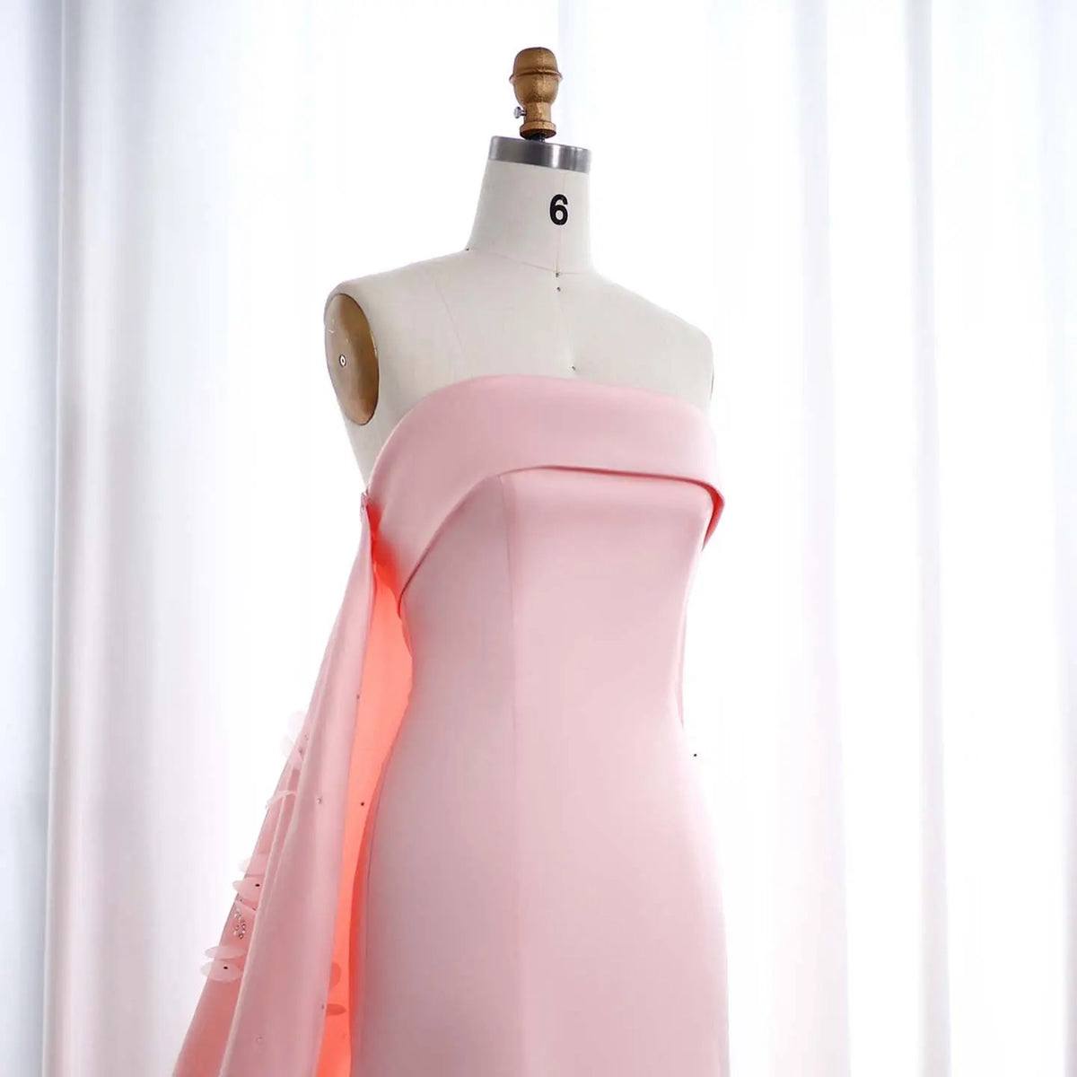 Blush Pink Strapless A-Line Evening Gown with Floral Embroidery & Cape Train