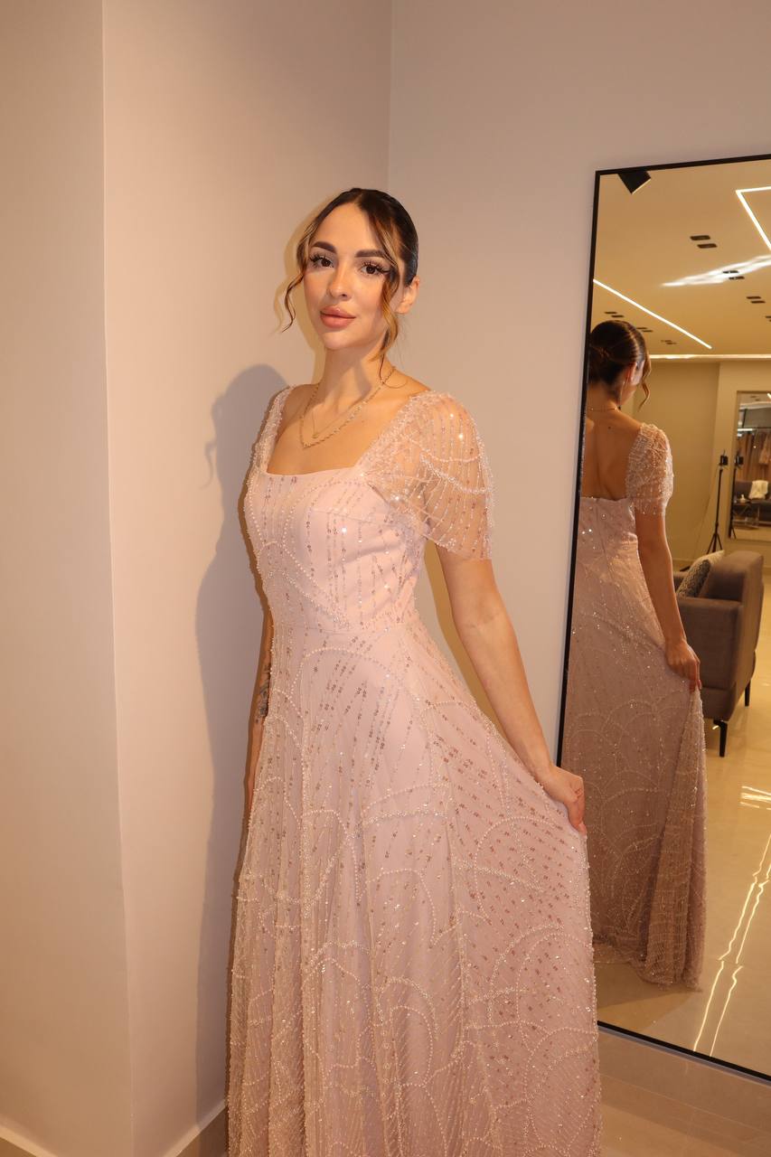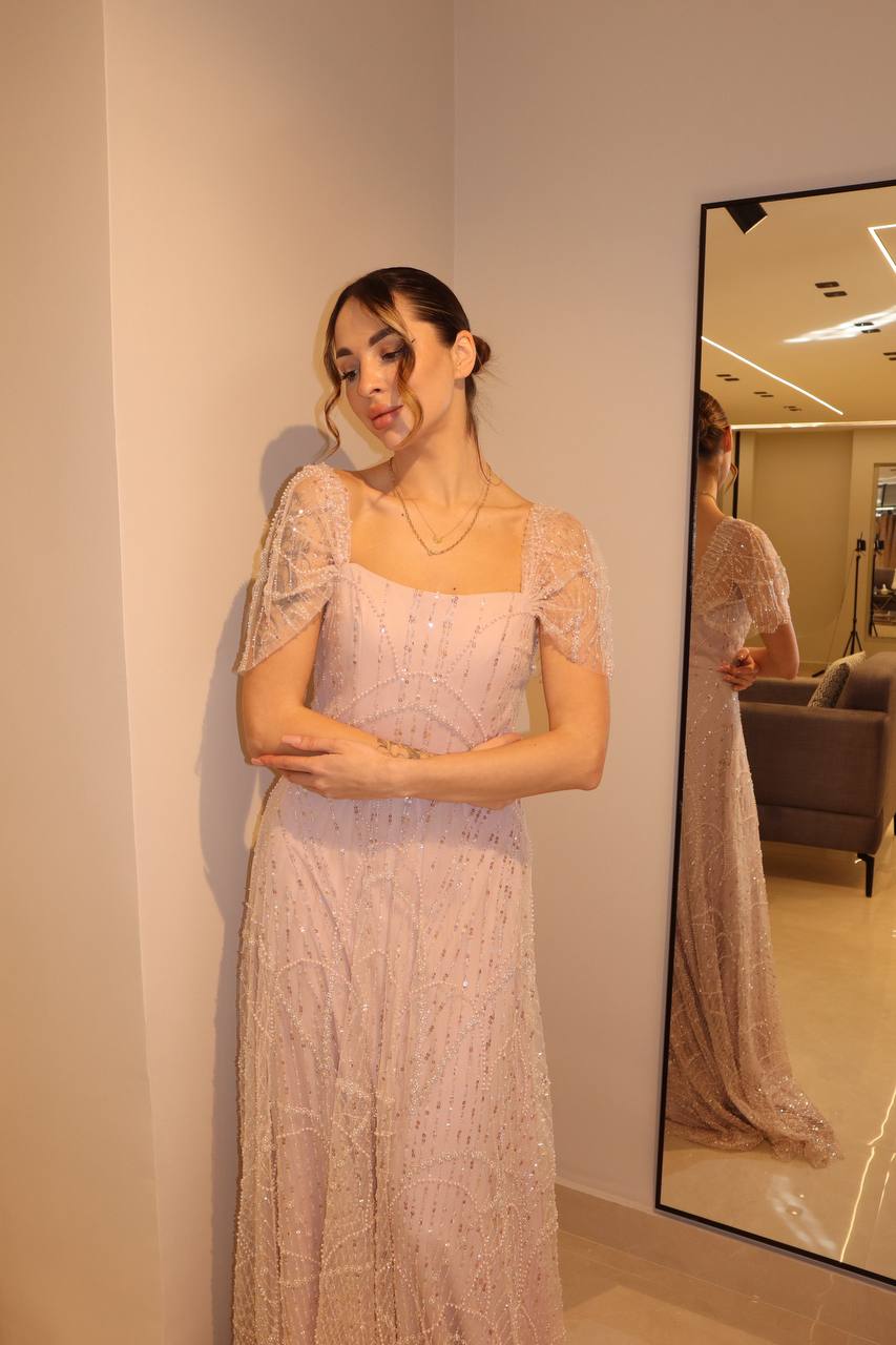 Blush Quartz Architectural Gown with Dropped Beaded Sleeves and Filigree Skirt