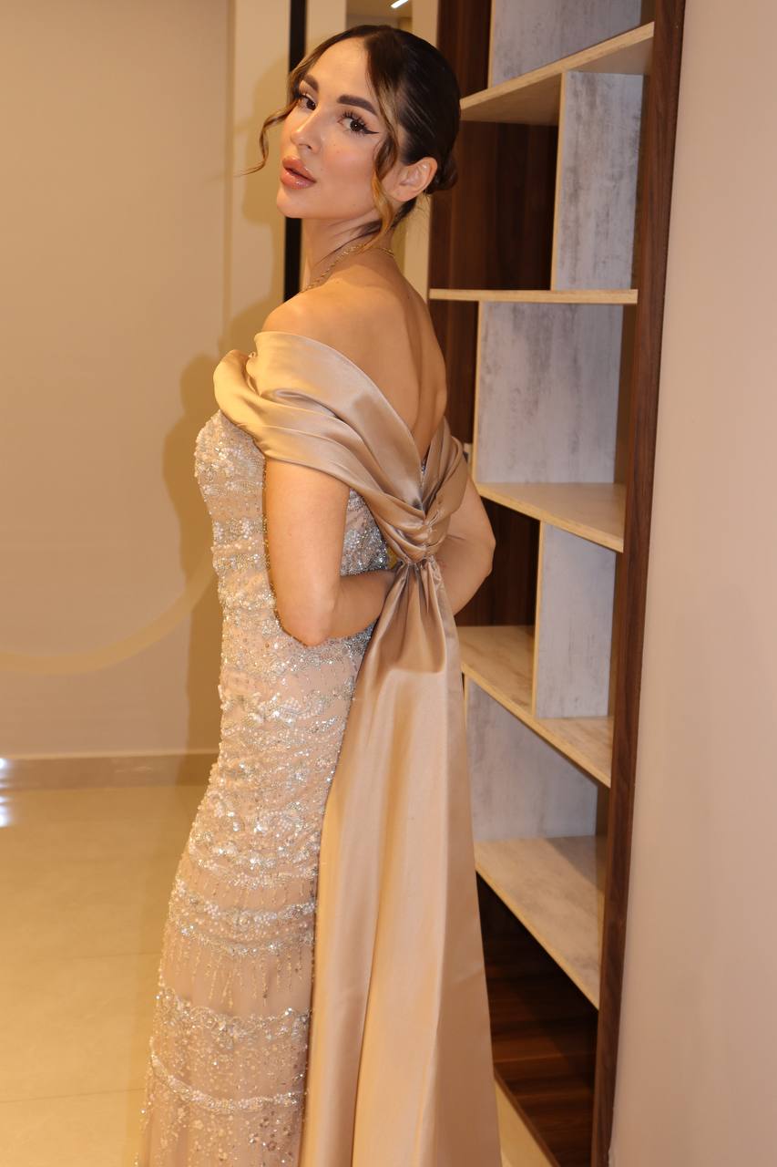 Exude timeless luxury in this breathtaking champagne evening gown, a sculptural masterpiece designed for high-profile glamour. The form-fitting column silhouette is meticulously hand-beaded with horizontal bands of shimmering crystals and micro-pearls, creating a radiant, jewelry-like finish. This exquisite core is balanced by a bold, structured satin wrap that drapes elegantly across the shoulders, featuring a delicate knot detail that adds a modern architectural touch. Finished with a dramatic floor-sweeping satin overskirt, this gown offers a statuesque presence perfect for the most prestigious events.
