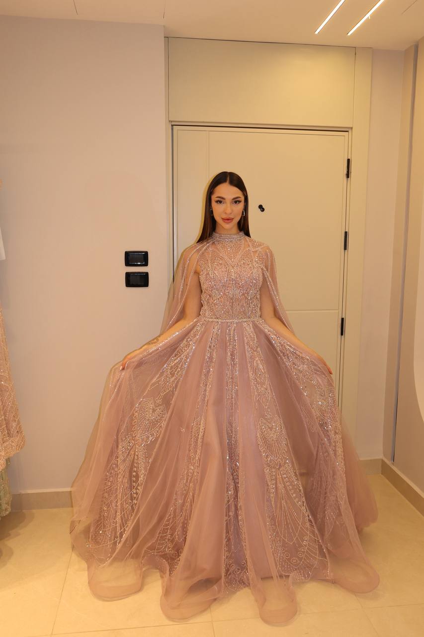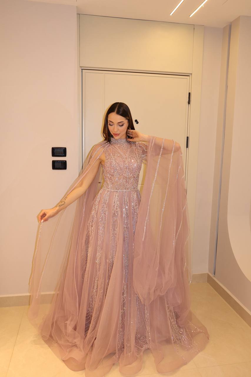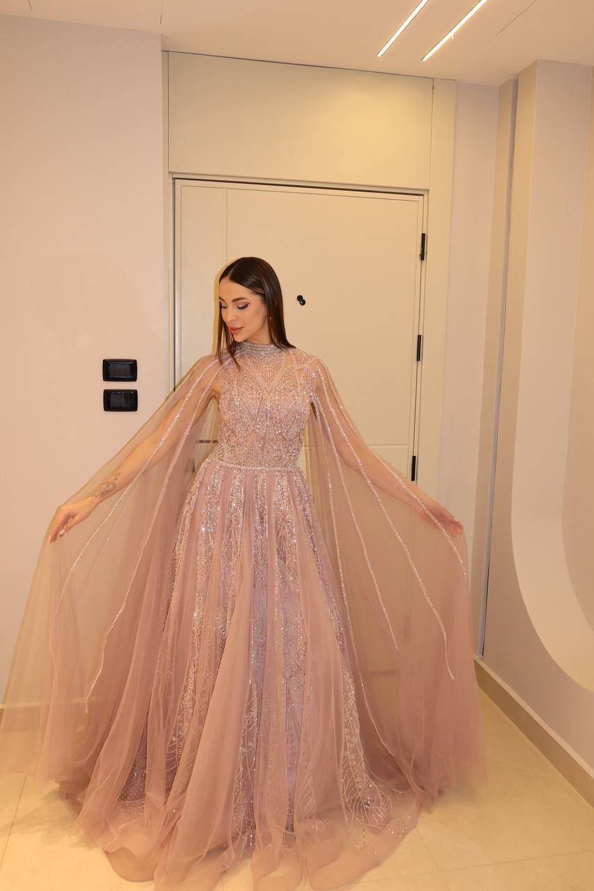 Step into a world of enchantment with this ethereal dusty rose gown, designed to make every movement look magical. The bodice is intricately hand-beaded with shimmering crystals and sequins in a geometric sunburst pattern that catches the light beautifully. Featuring a sophisticated high neckline and a breathtaking floor-length cape that flows seamlessly from the shoulders, this dress offers a regal yet romantic silhouette. The voluminous tulle skirt adds a soft, airy finish, making it the perfect choice for the modern woman who wants to combine traditional elegance with avant-garde flair.