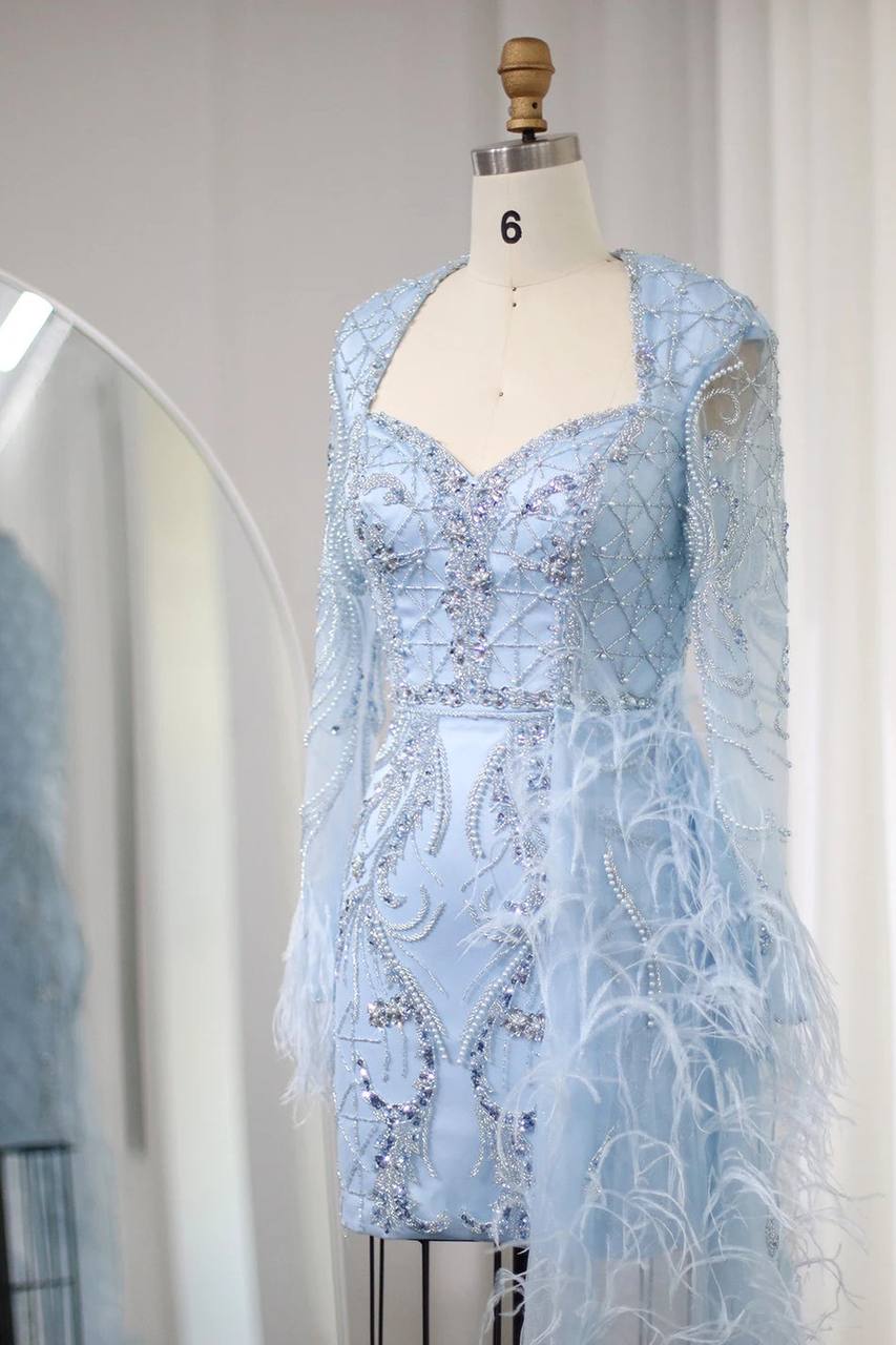 Explore the Ice Blue Embellished Mini Gown at Lprme. Features Intricate Beadwork, Sheer Sleeves & a Dramatic Feather Train. Perfect for Luxury Parties.