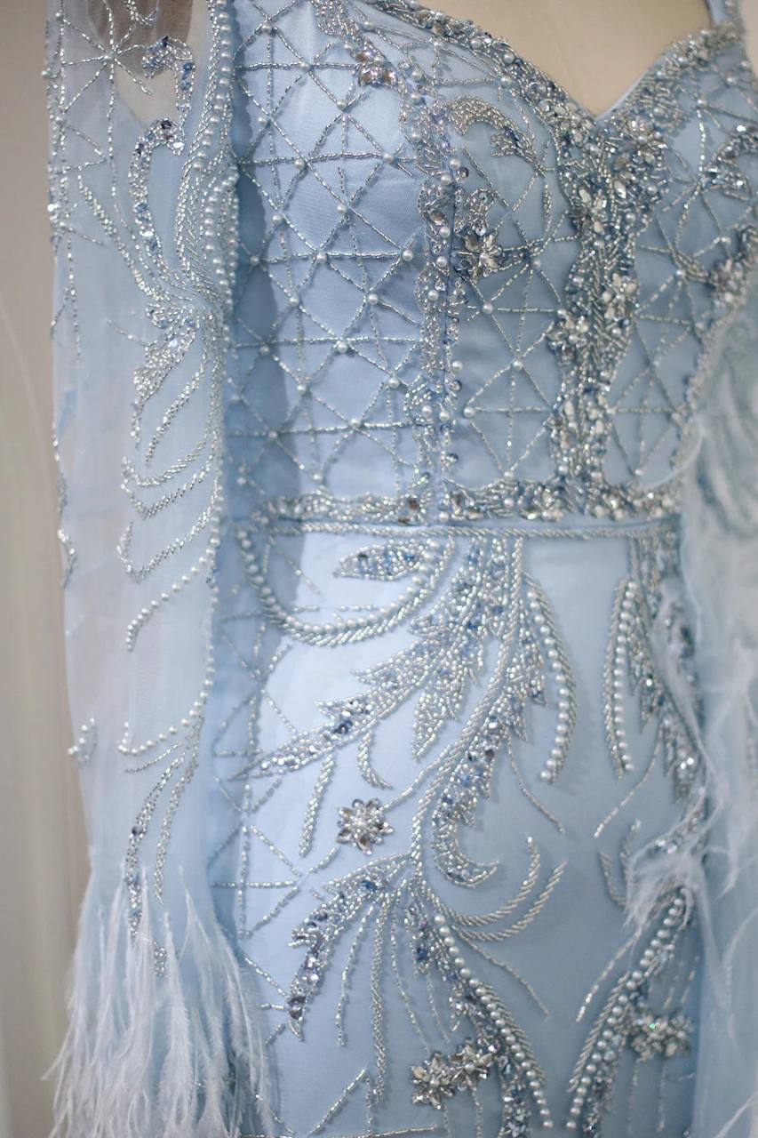 This stunning ice blue mini gown blends modern glamour with couture detailing. Featuring a fully embellished bodice and sleeves, the dress sparkles with intricate beadwork and sequins. The fitted silhouette highlights the figure, while the dramatic feather-accented side train adds movement and elegance. Perfect for premium evening events, cocktail nights or red-carpet occasions, this dress offers a bold yet sophisticated statement.