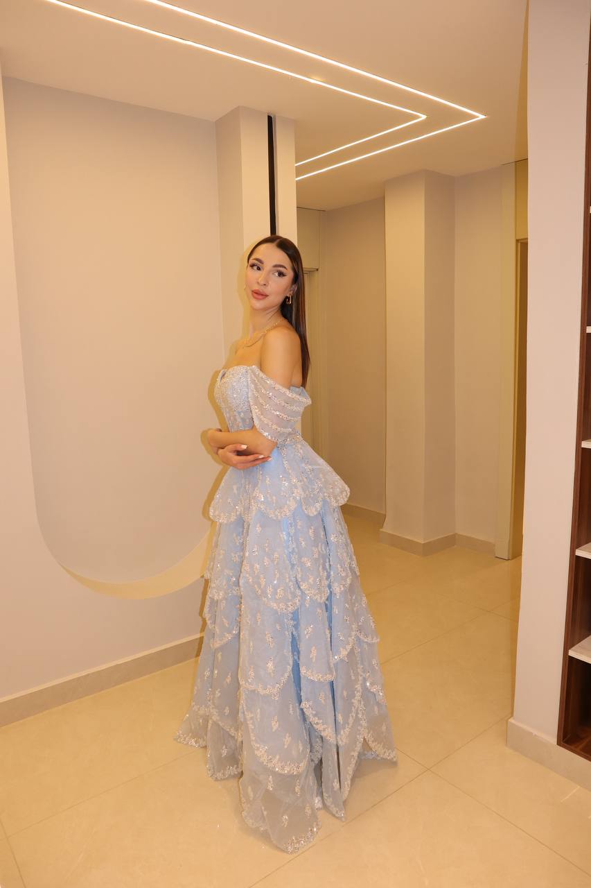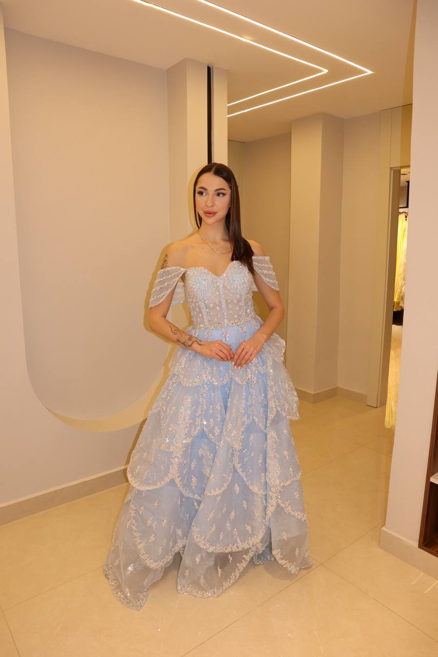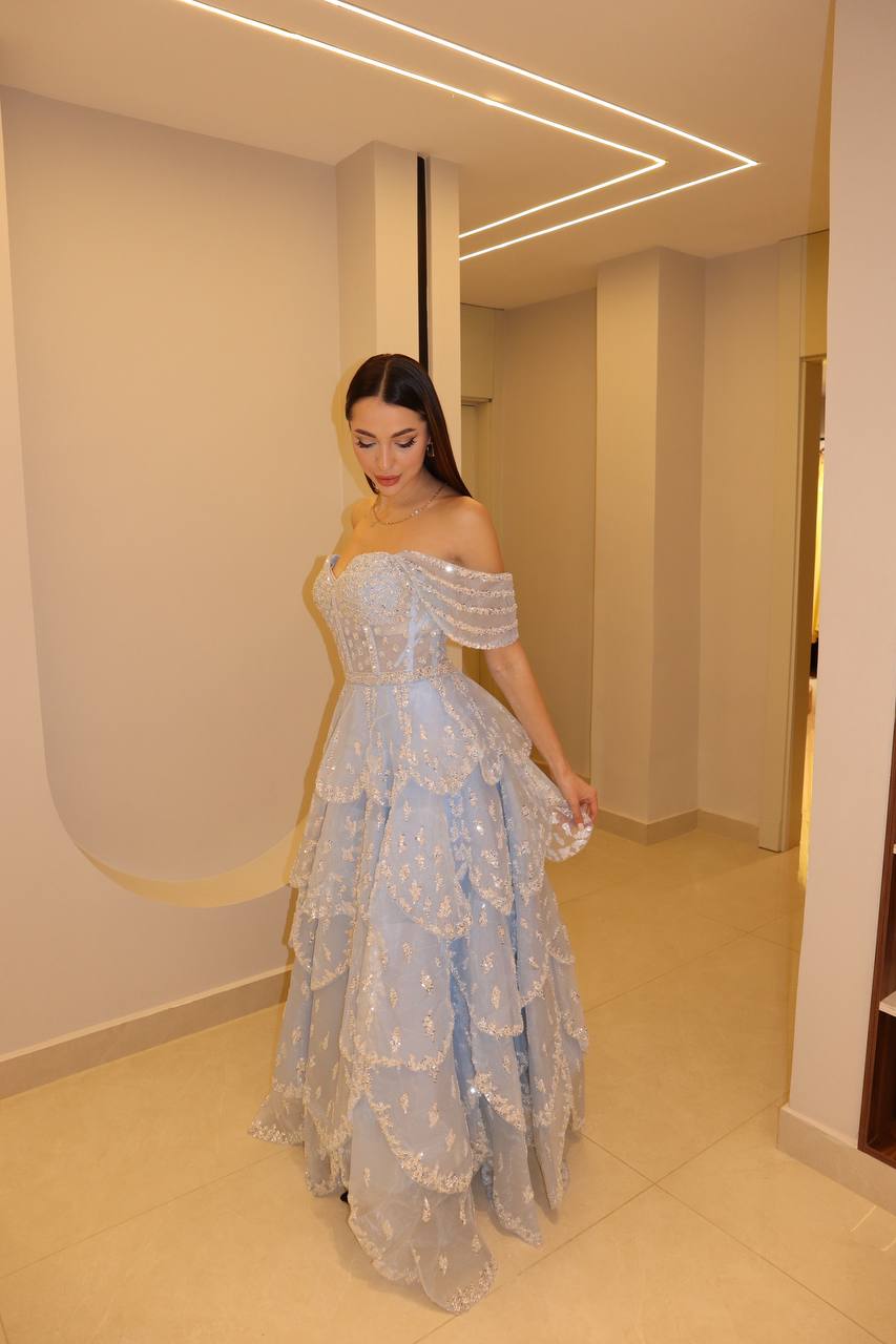 Embrace a fairytale aesthetic with this breathtaking ice blue gown, designed for the woman who desires a high-fashion, whimsical presence. The semi-sheer corseted bodice is meticulously structured and adorned with handcrafted 3D floral appliqués and shimmering silver beadwork. Featuring romantic off-the-shoulder draped sleeves, the design flows into a spectacular tiered skirt. Each layer of fine tulle is finished with a delicate scalloped edge and drenched in crystalline embroidery, creating a voluminous, floor-sweeping silhouette that radiates ethereal luxury and statuesque grace.