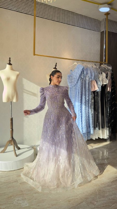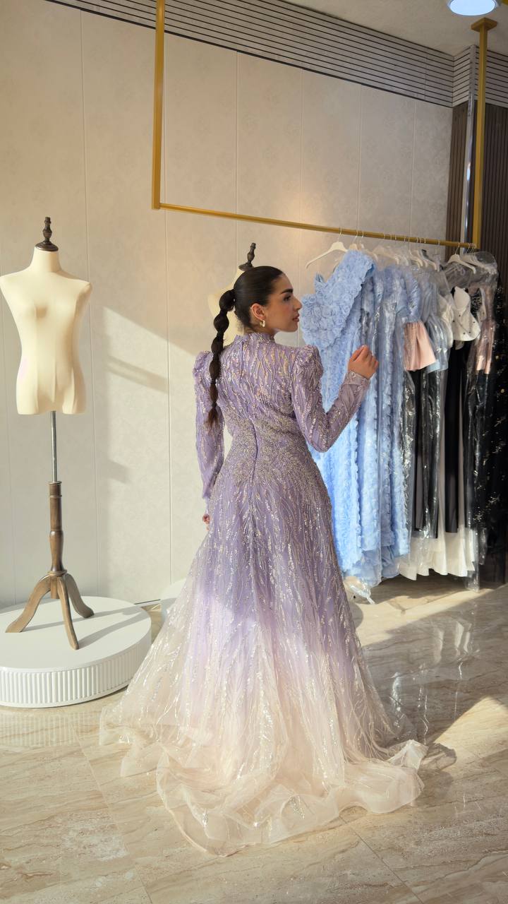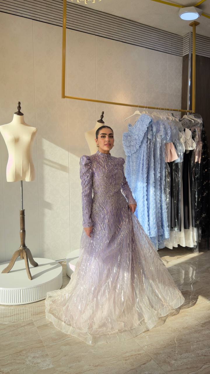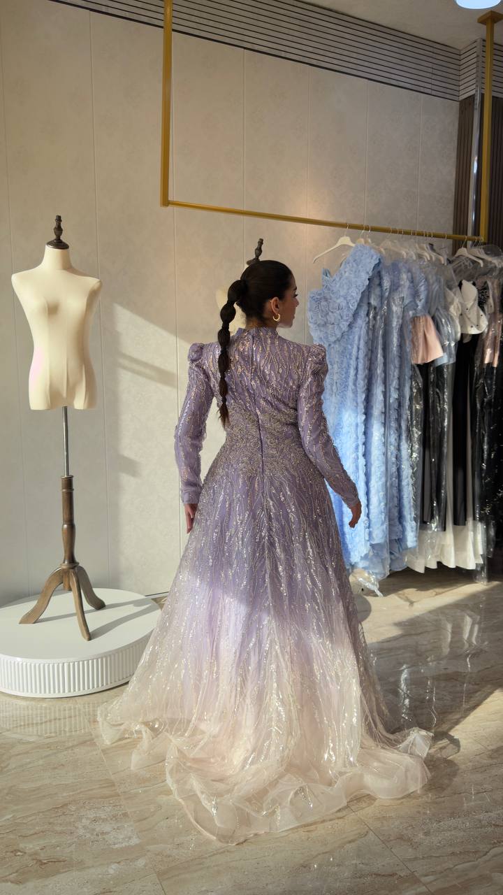 Exude grace and sophistication with this beautifully crafted lavender gown designed for timeless elegance. Featuring a high neckline and full sleeves, this piece offers a refined and modest silhouette without compromising on luxury.