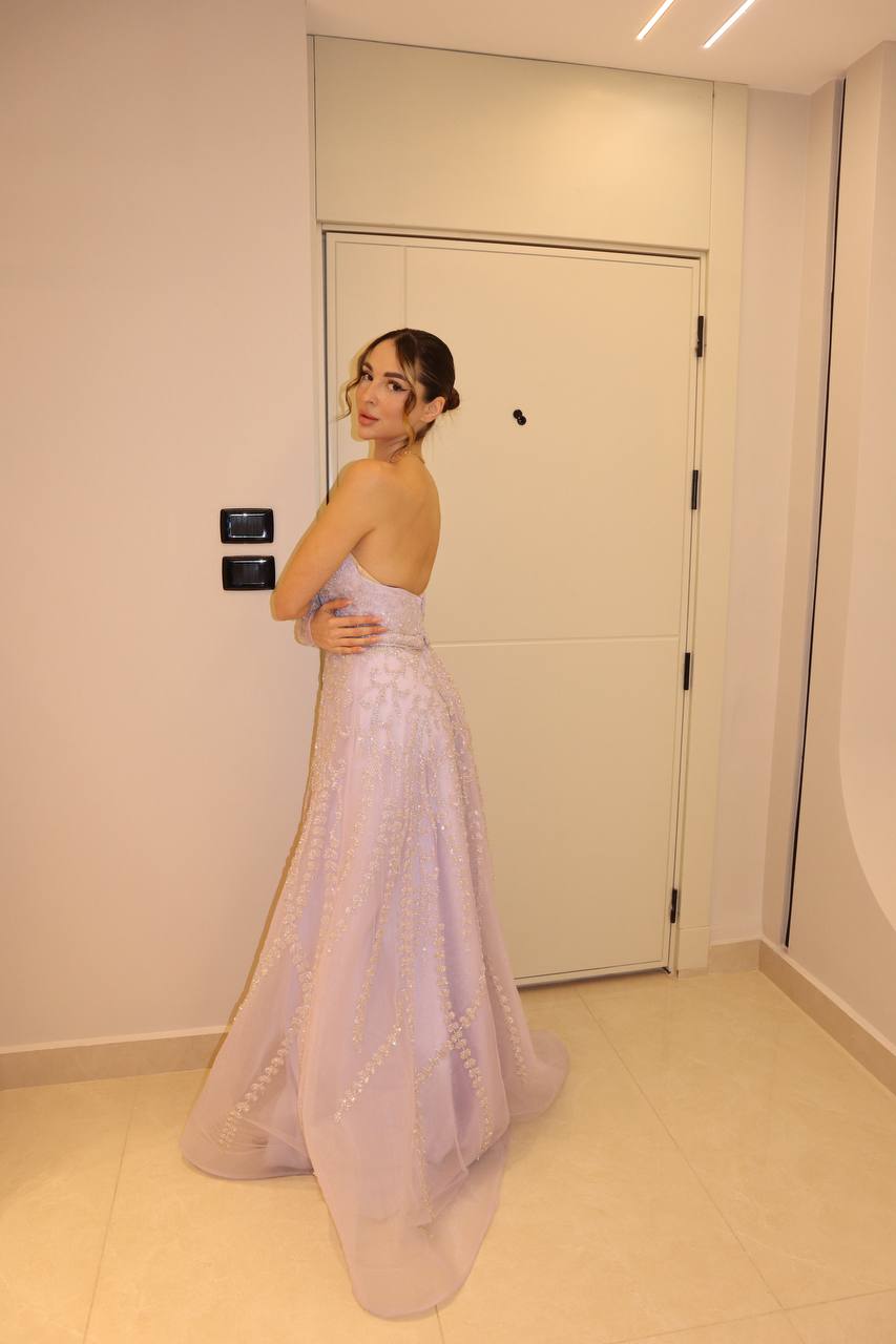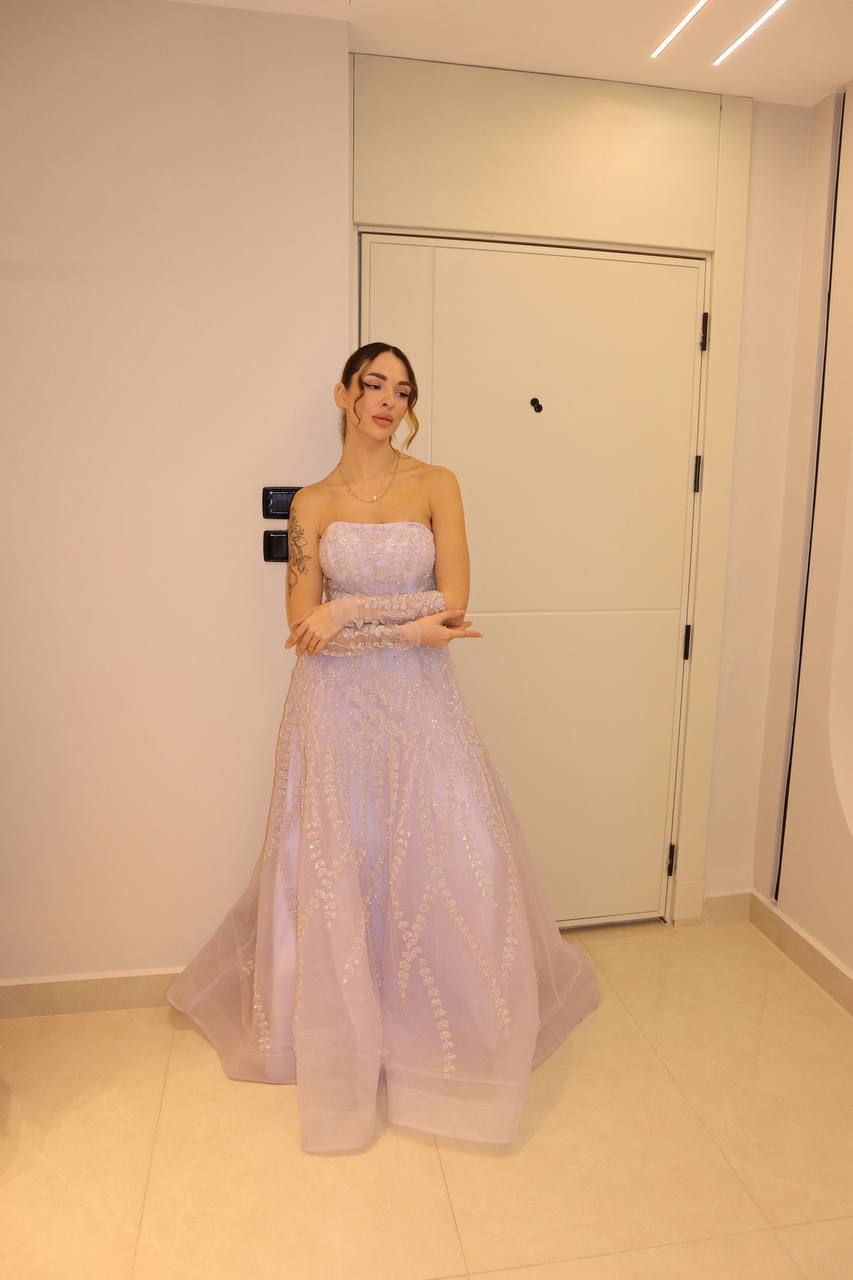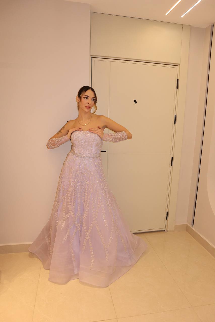 Exude ethereal grace in this lavender orchid masterpiece, a gown that balances classic romanticism with high-fashion drama. The strapless bodice is meticulously hand-beaded with silver filigree and trailing floral motifs that cascade down into a voluminous A-line skirt. This design is elevated by a pair of matching, sheer opera-length sleeves, lavishly embellished with the same intricate beadwork to create a seamless and regal look. Crafted from premium layers of shimmering tulle, this gown is designed for the woman who seeks a poetic, statuesque presence at her most prestigious celebrations.