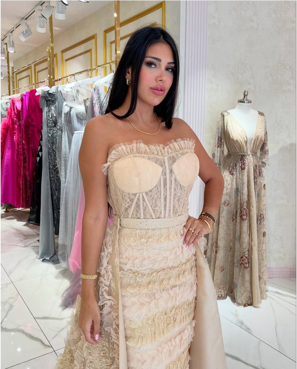 ImageLuxury Champagne Corset Gown with Layered Ruffle SkirtSage Green Strapless Embellished Corset Gown with Chiffon Skirt & Neck CapeSky Blue Embellished Princess Gown with Sheer Cape SleevesChampagne Embellished Full Sleeve Gown with Sheer CapeBlush Pink Evening Gown with Sheer Beaded CapeRed Off-Shoulder Mermaid Evening Gown with 3D Floral Appliqué Train