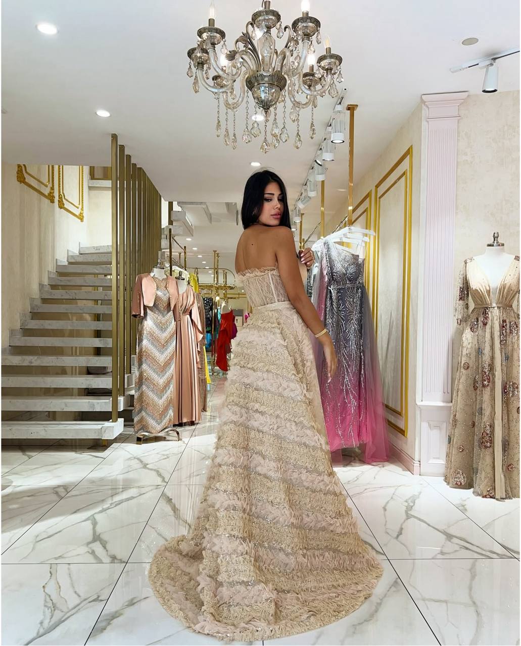 Step into elegance with this stunning champagne-toned couture gown designed for statement-making occasions. Featuring a structured corset bodice that beautifully contours the silhouette, this piece blends modern sophistication with timeless glamour.