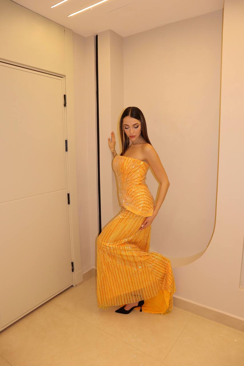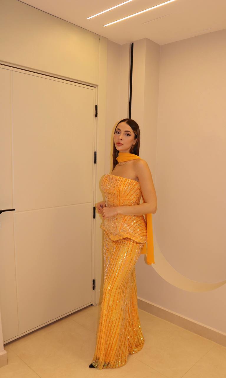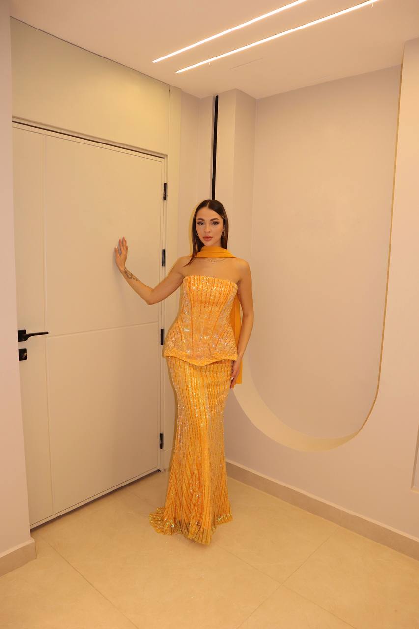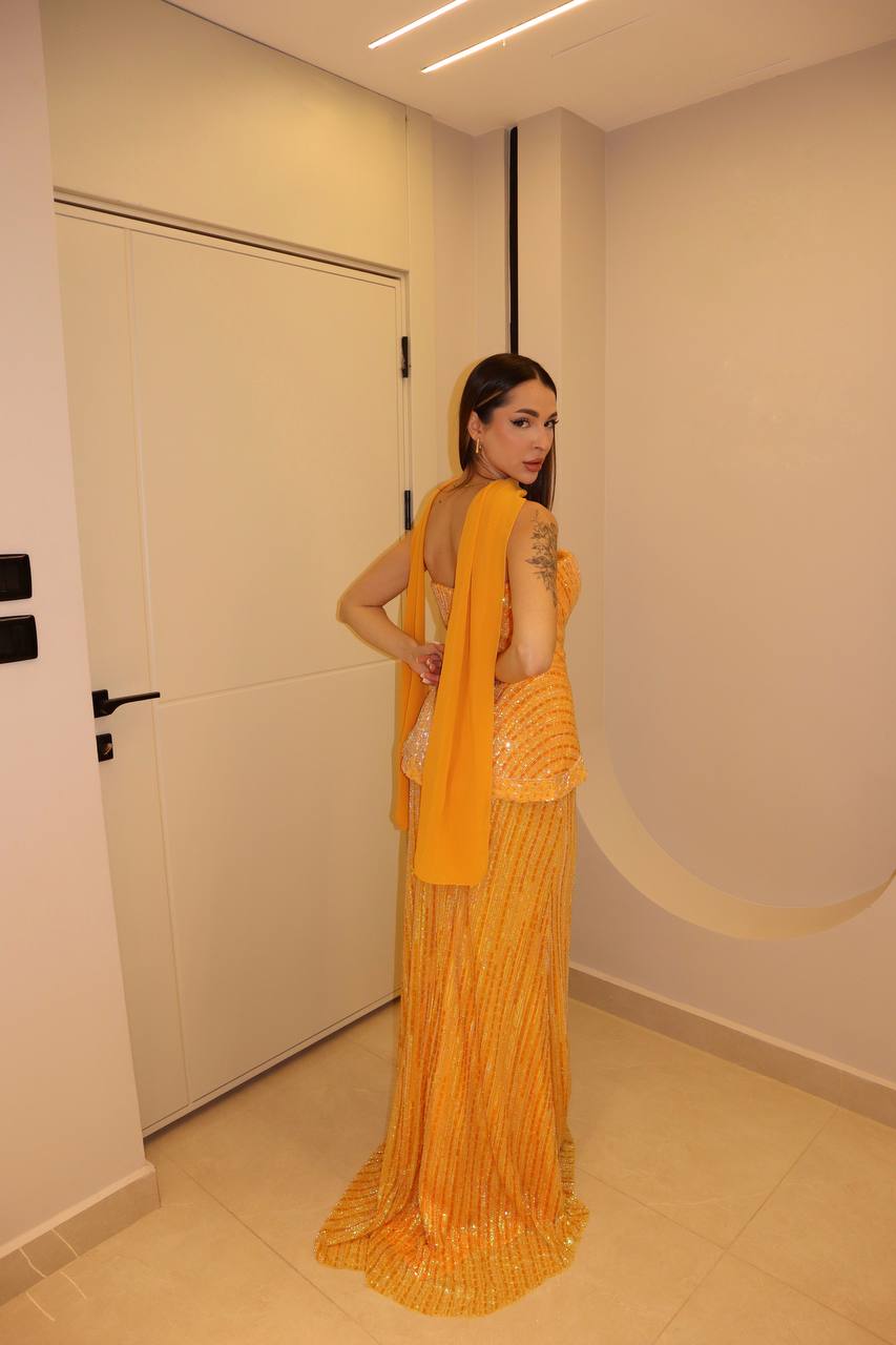 Radiate the warmth of a Mediterranean sunset in this high-octane marigold masterpiece. This statuesque gown is drenched in vertical linear sequin embroidery, meticulously hand-placed to create a shimmering, elongating effect. The architectural bodice features a structural basqued peplum that cinches the waist, offering a modern twist on classic couture tailoring. A matching, lightweight silk-chiffon scarf adds an element of timeless Hollywood glamour, while the sleek column skirt flows into a floor-sweeping hem. This ensemble is designed for the woman who seeks to make a bold, sophisticated statement at the most prestigious evening events.