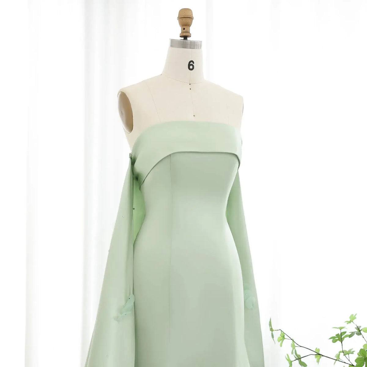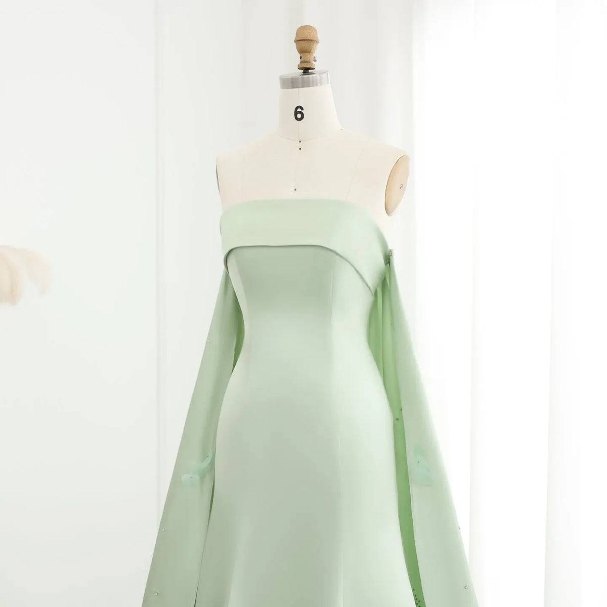 Mint Green Strapless A-Line Evening Gown with Embroidered Train & Cape