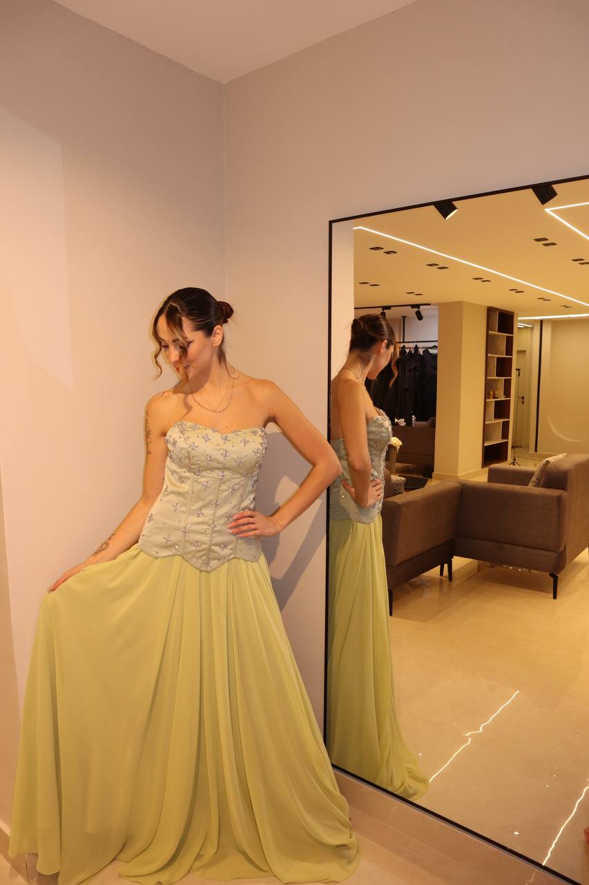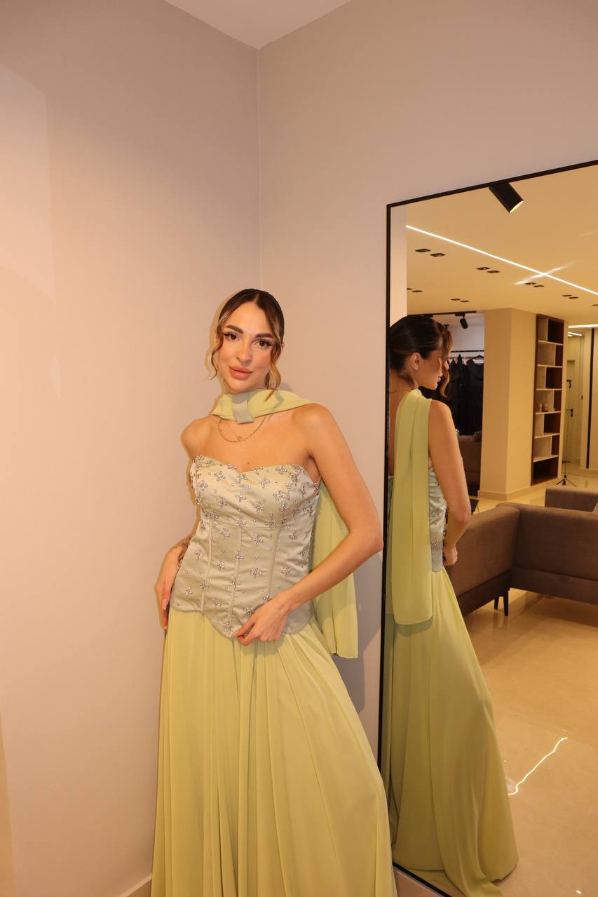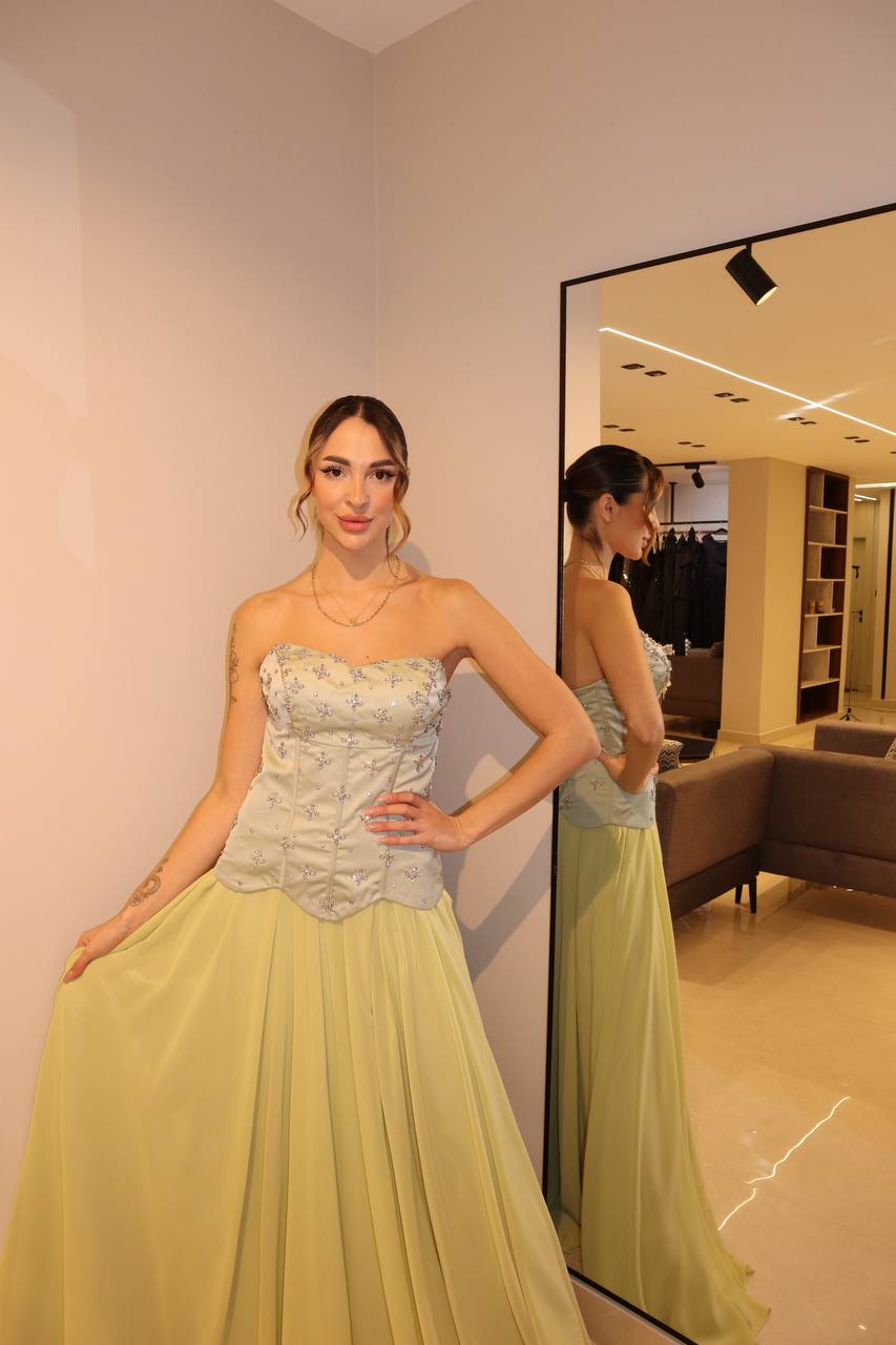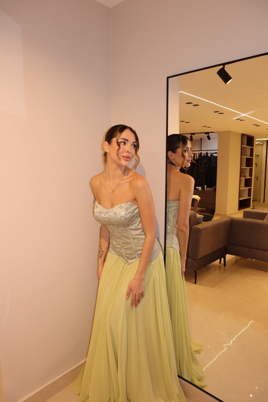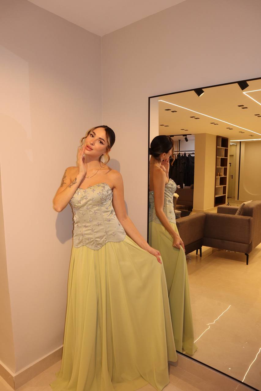 Step into refined elegance with this sage green evening gown, designed to blend modern structure with soft, flowing femininity. The strapless corset-style bodice is beautifully adorned with delicate embellishments, offering a structured and flattering fit that enhances the silhouette.