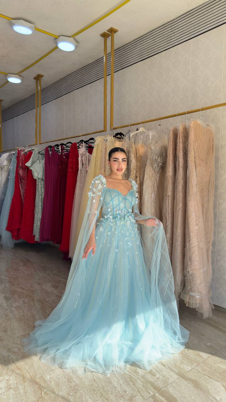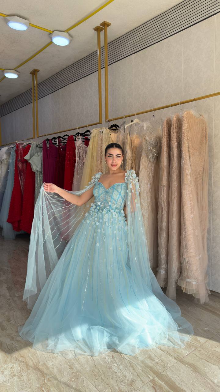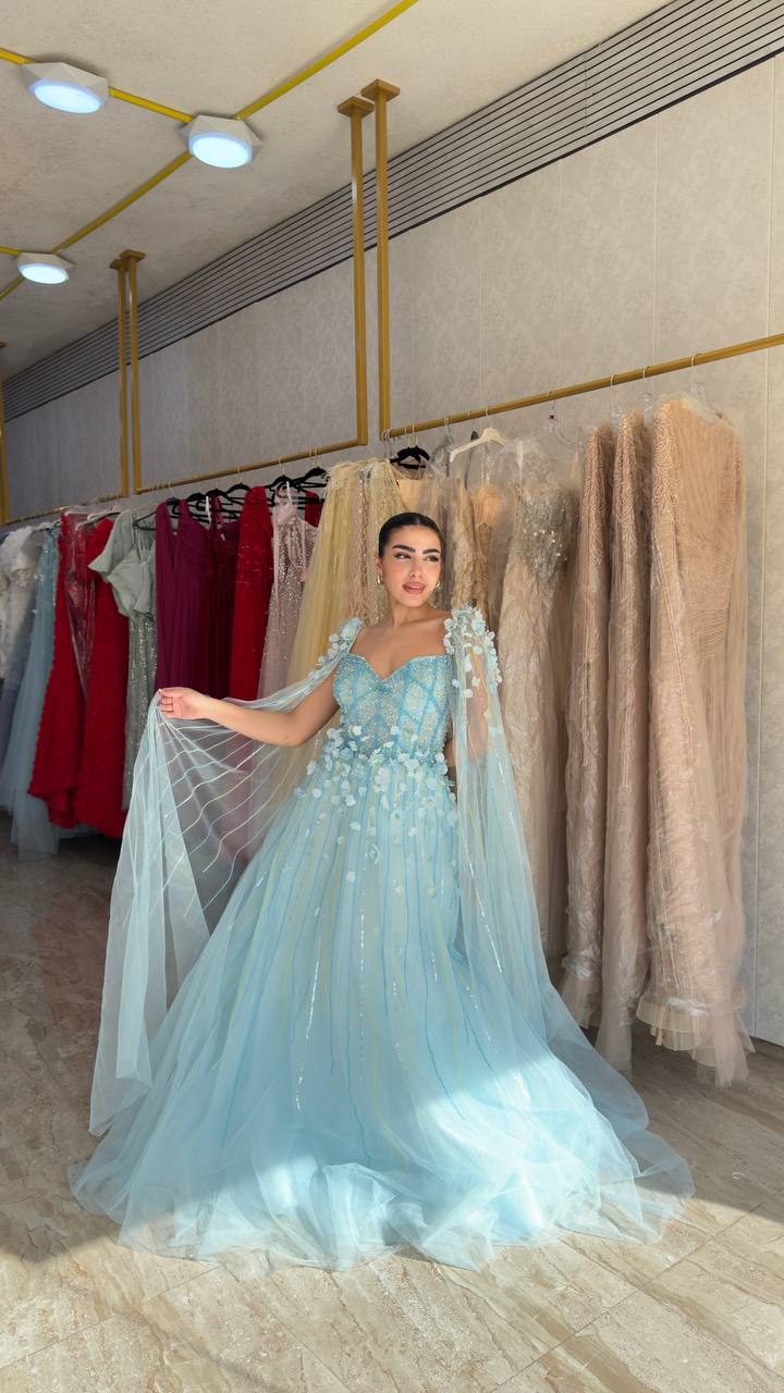 Step into a fairytale with this enchanting sky blue gown designed to capture elegance and charm. Featuring a beautifully structured bodice adorned with delicate floral embellishments, this gown creates a soft and romantic silhouette.