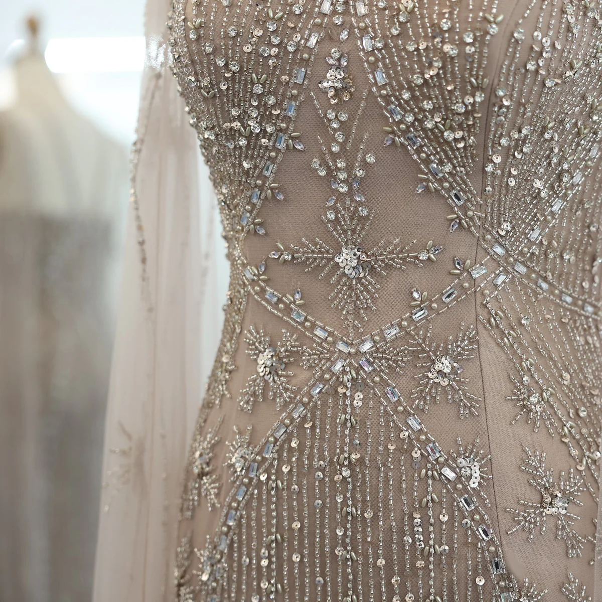 HomeShopWedding GownsChampagne Embellished Evening Gown with Sheer Cape Sleeves