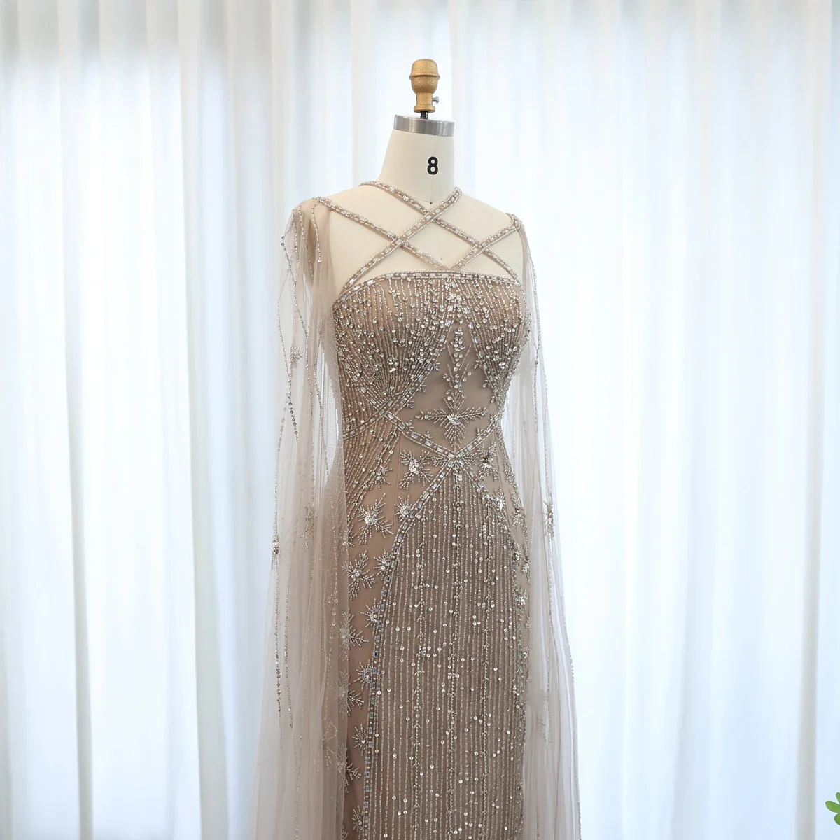 Champagne Embellished Evening Gown with Sheer Cape Sleeves