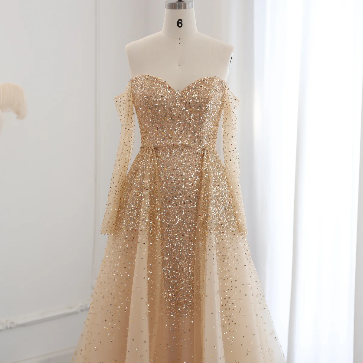 Turn Heads in This Gold Glitter Off-Shoulder Ball Gown with Sweetheart Neckline and Layered Tulle Skirt-ideal for Weddings, Receptionsand Glamorous Galas.