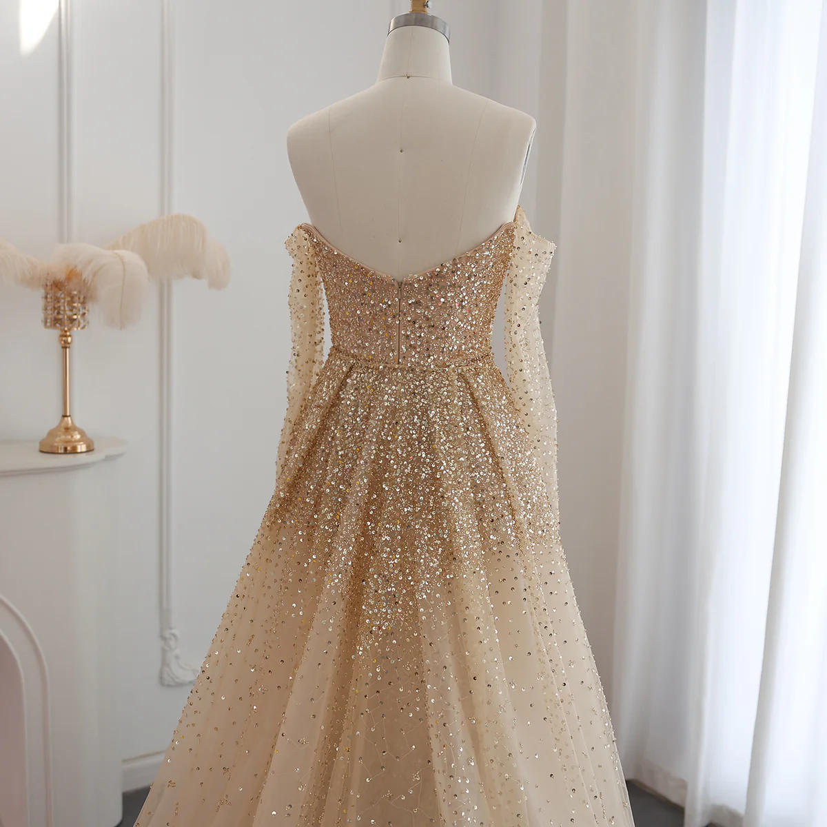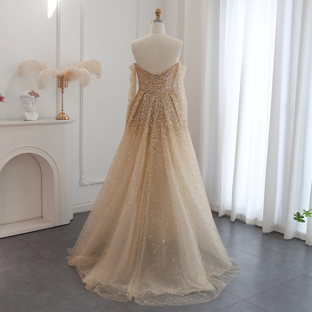 | Description | Turn Heads in This Gold Glitter Off-Shoulder Ball Gown with Sweetheart Neckline and Layered Tulle Skirt-ideal for Weddings, Receptionsand Glamorous Galas. | Shop This Elegant Silver Sequin Evening Dress Featuring a Square Neckline, Long Sleeves & Feather Accents. A Perfect Choice for Parties, Weddings & Formal Events. | Champagne Beaded Evening Gown with Off-Shoulder Sleeves, Slim-Fit Bodiceand Floor-Length Train. Perfect for Weddings, Receptionsand Gala Events. | Make a Statement in This White Evening Gown Featuring Beaded Cape Sleeves, Jeweled Waist and a Voluminous Ruffled Hem-Ideal for Weddings and Gala Events. | Dazzle in This Champagne Embellished Evening Gown with Sheer Cape Sleeves, Criss-Cross Necklineand Intricate Sequin Beadwork-perfect for Galas & Weddings. | Stunning Blue Ruffle Ball Gown with a Sheer Corset Bodice, Tulle Sleeves and Layered Skirt. a Dreamy, Elegant Dress Perfect for Prom, Galas and Special Events. | ||||||||||||